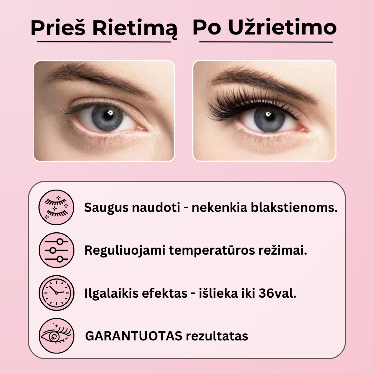 Taip, rekomenduojama pirmiausia užtepti blakstienų tušą, o tada naudoti rietiklį. Šildomas rietiklis užries blakstienas jau padengtas tušu, suteikdamas joms dar daugiau apimties ir ilgumo.